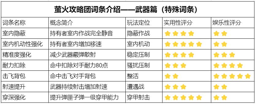 嗨!各位萤火虫,欢迎来到萤火攻略团攻略教学内容!武器词条多种多样,有些极其特殊,只在单种枪支上出现,这无疑带给了枪支独特的玩法。有些时候,在封锁区整个大活也不错!本期萤火攻略团将给大家讲解武器特殊词条的属性玩法,常见词条(重伤、斩杀等)见上篇攻略,帮助各位萤火虫掌握词条特性,在封锁区找到适合自己的玩法!