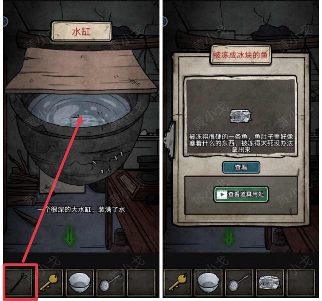 12.点击大锅,放入【被冻成冰块的鱼】,用【烧开的水壶】融化,在鱼肚子里获得【钥匙】