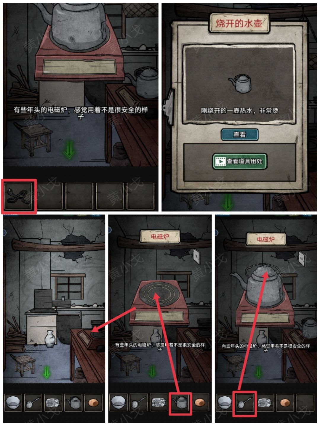 11.(厨房左)点击电磁炉,放上【烧水壶】,倒入【盛满水的水舀子】,插上【电源线】,烧开水,获得【烧开的水壶】