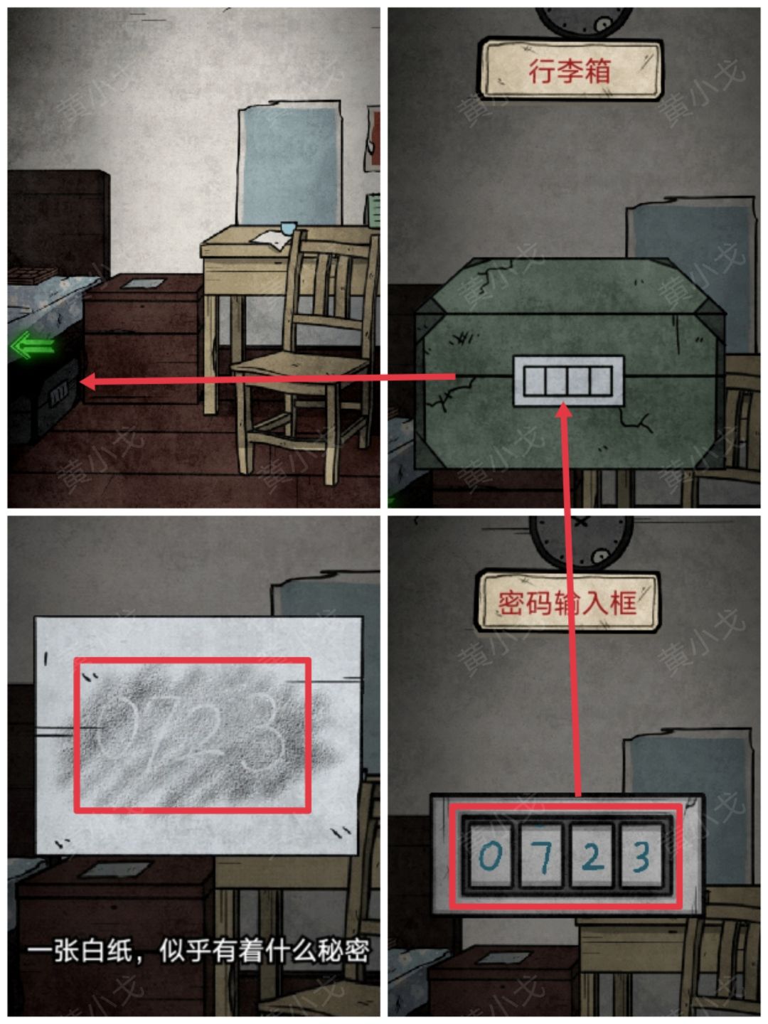 16.点击床底的行李箱,根据白纸上的线索,输入密码:0723