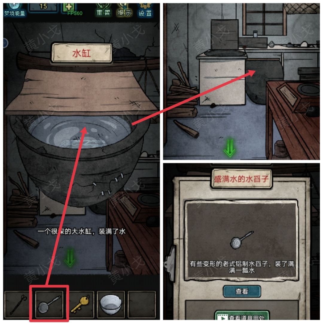 5.点击水缸,用【老式铝制水舀子】装水,获得【盛满水的水舀子】