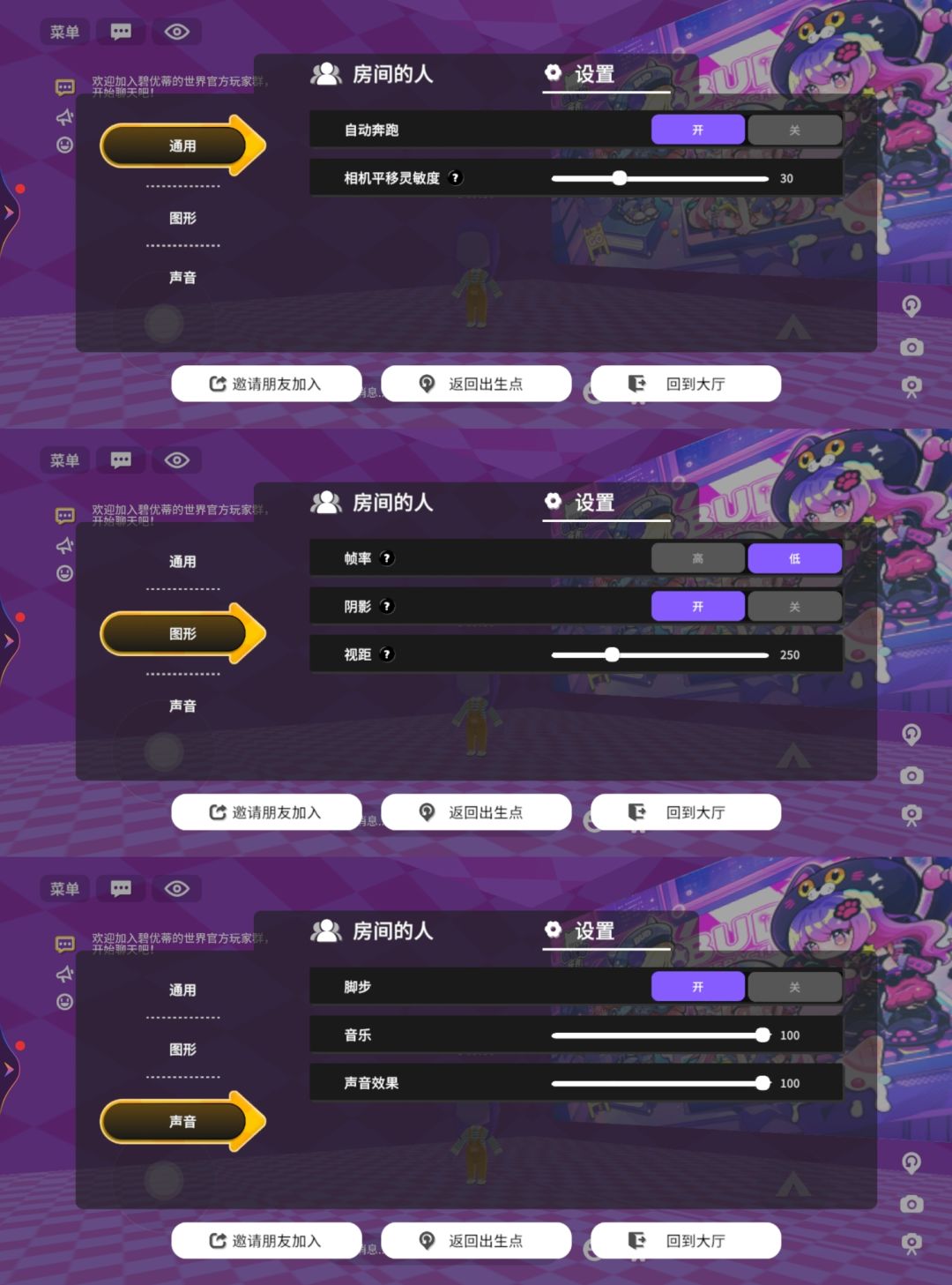 〖声音〗可调整脚步声,背景音乐和声音效果