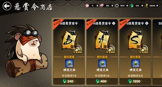 5. 商店有忍币购买的悬赏的话,忍币够尽量买,尤其是A级和S级悬赏,可以加速宝物制作,但不推荐花勾玉购买悬赏,每天可以花40勾玉刷新商店,获取更多悬赏等资源。
