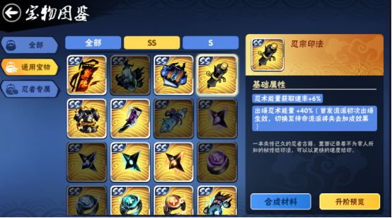 4. 前期缺宝物和图纸的时候不要太过着急,仅为了1个s宝物或ss宝物,就胡乱喂掉其他重要宝物或撕掉重要图纸,在做宝物的时候可以多看看宝物图鉴里对宝物制作的具体指导,比如忍宗至少需要8张ss图纸和8个兵粮丸、8个S忍宗,这些宝物和图纸推荐留一下。