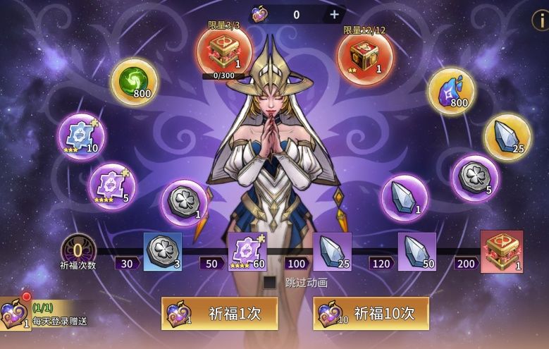 ②祈福达到指定次数可以额外领取奖励,祈福200次必得1个虚无角色随机宝箱进度奖励。