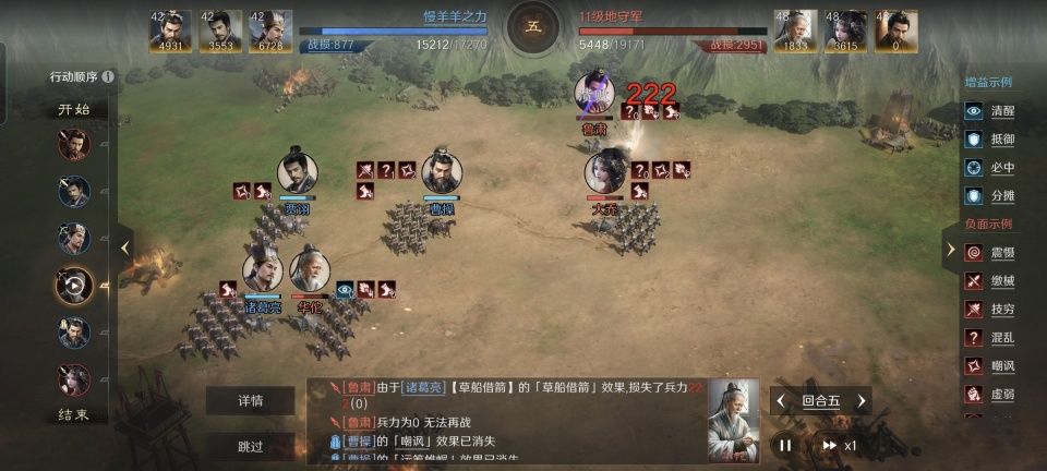 曹操选择了重盾兵作为主力,点亮了不屈和屹然不动,相较于普通盾兵,他具备了更多的减伤和自愈。为什么要单独拿一个技能槽学习狂风大作,答案在贾诩的身上。