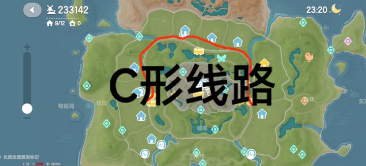 2、C形线路:这个线路是最全能的线路但不是效率最高的线路,这个线路所采集的苹果与橘子数是5/5开的,采集时间5分钟,是后期玩家最喜欢的线路之一(推荐)