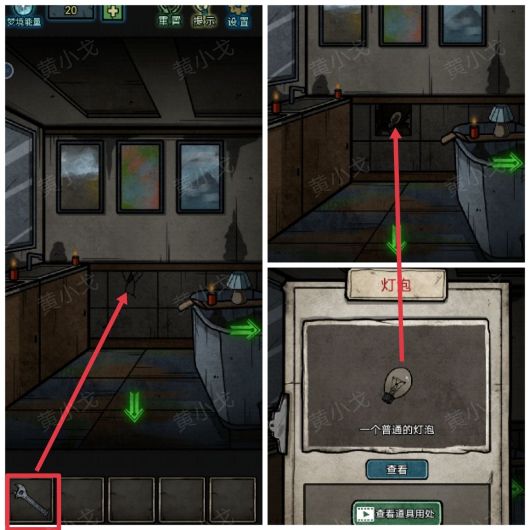 36.(浴室左)点击墙面裂缝处,用【扳手】砸开,获得【灯泡】