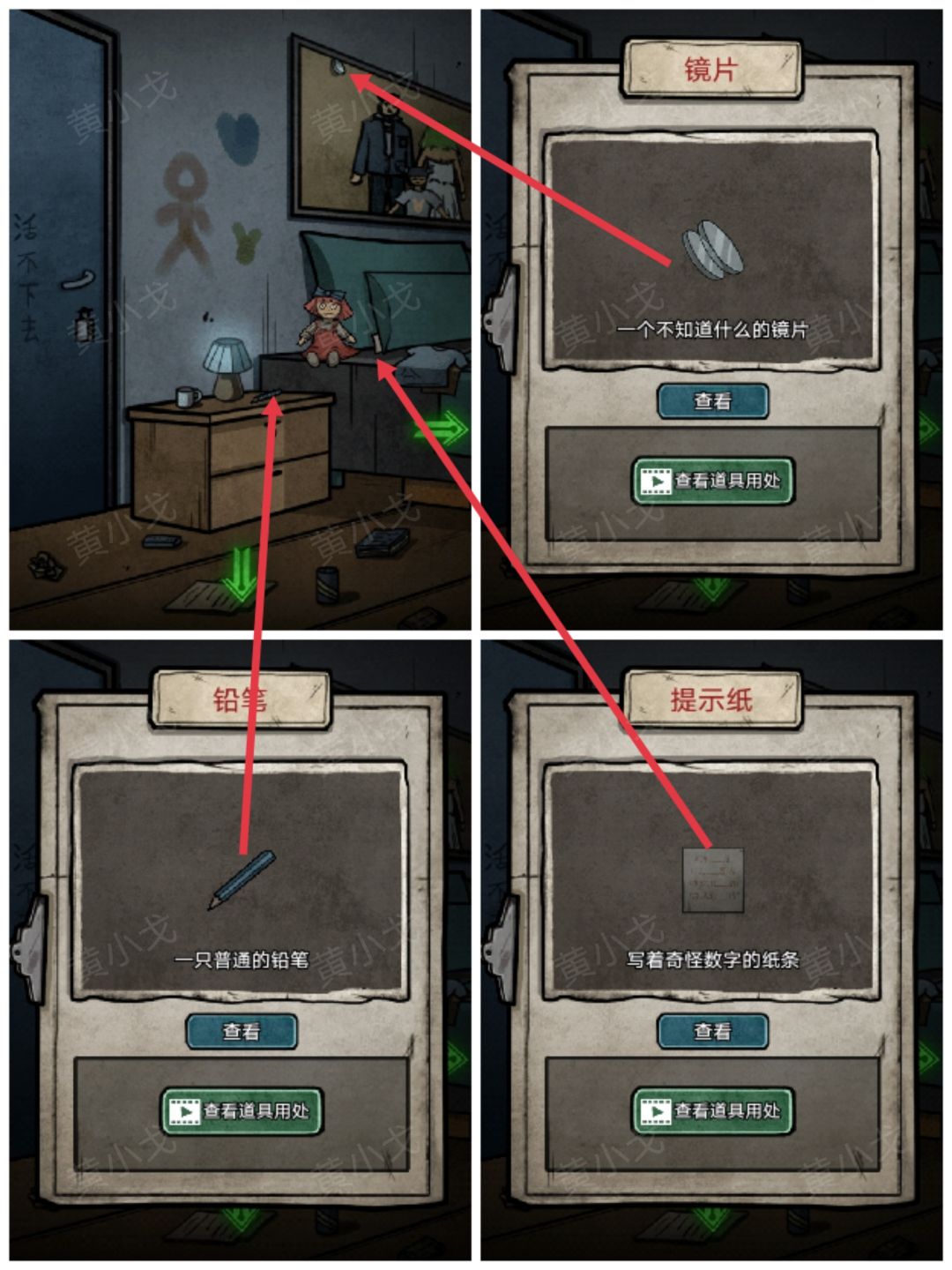 17.(卧室左)点击获取柜子上的【铅笔】、全家福上的【镜片】和枕头下面的【提示纸】