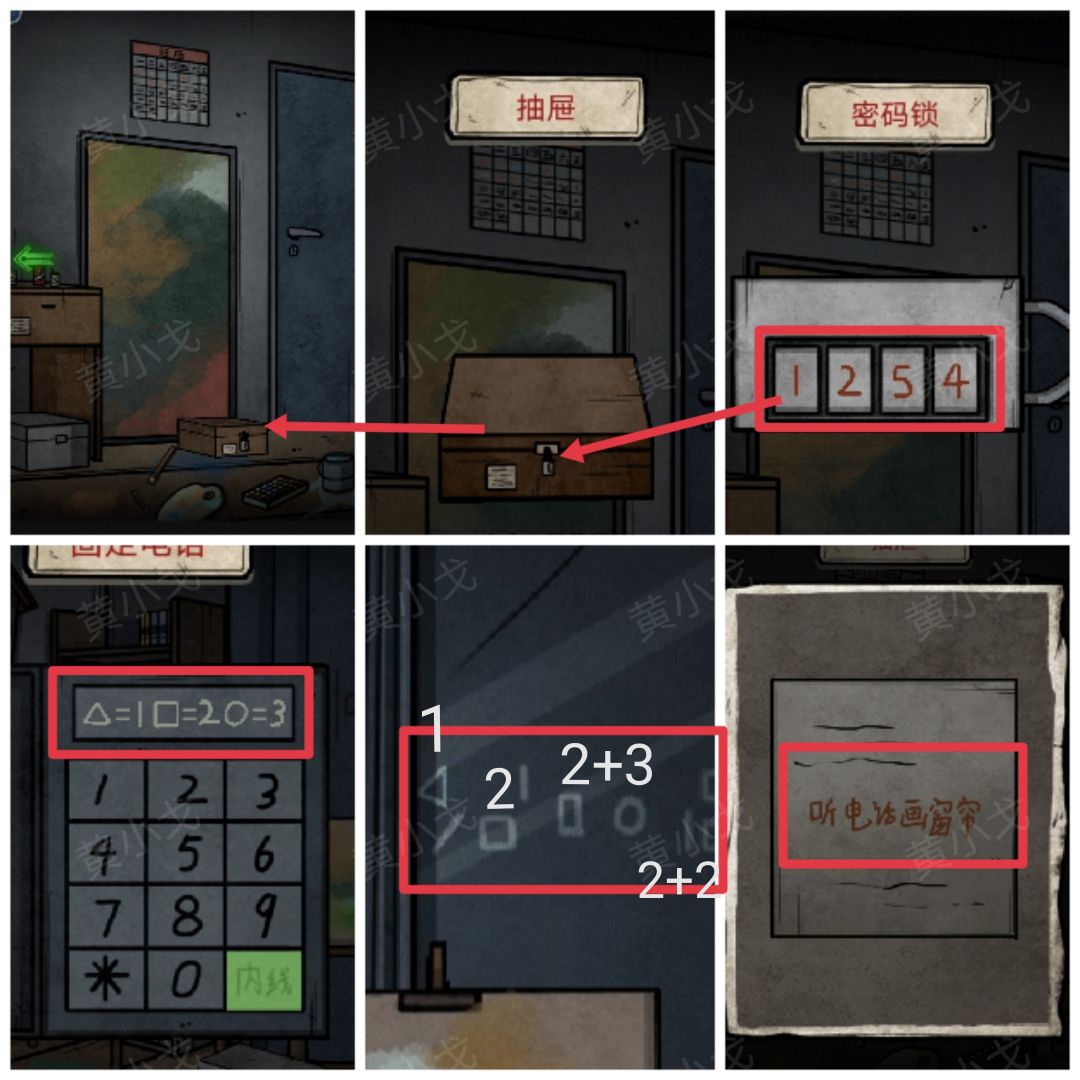 11.(画室右)点击地上的箱子,根据座机上的线索(三角形△=1、正方形□=2、圆○=3)、纸条上的线索(听电话画窗帘),结合玻璃上的图案,输入密码:1254