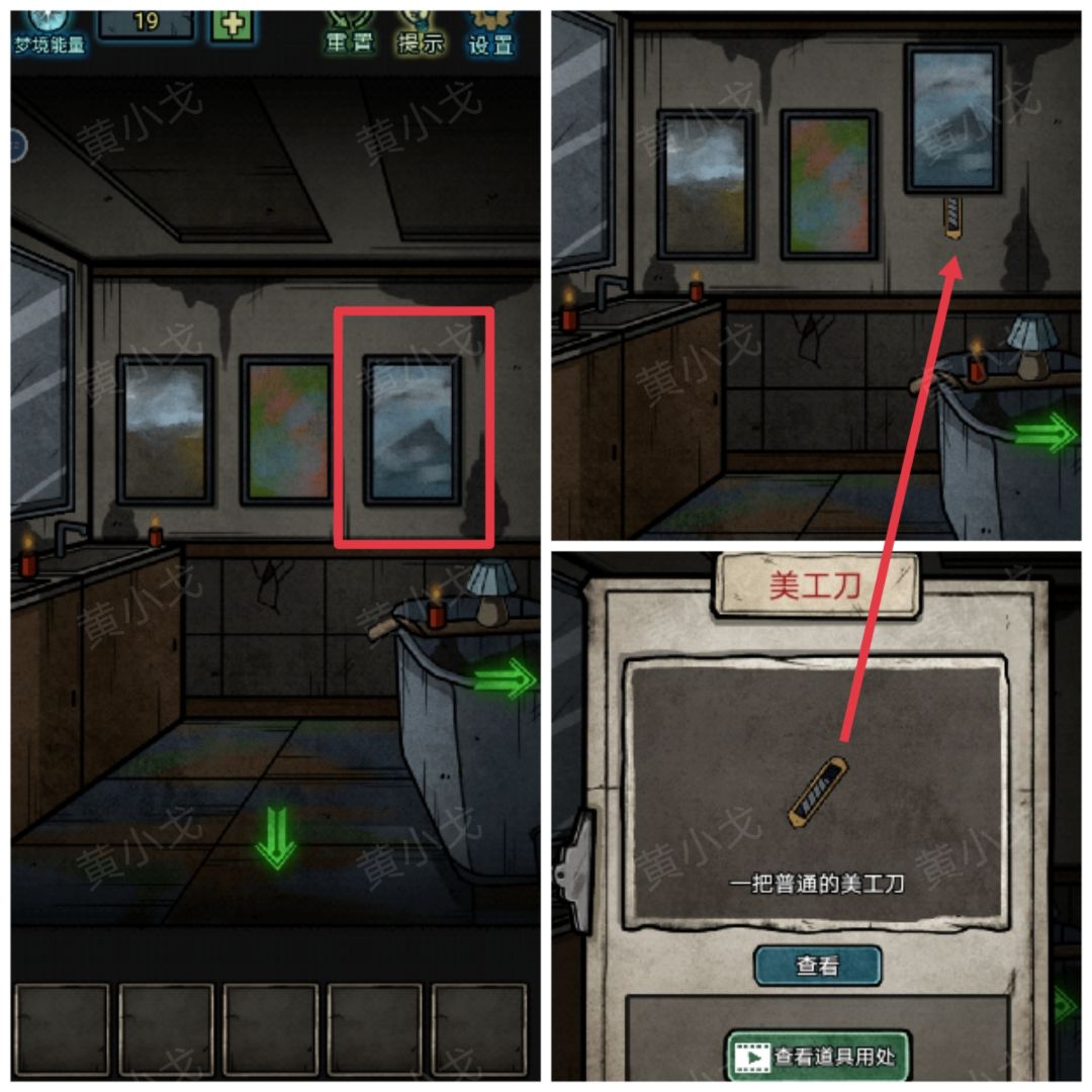 33.(浴室左)在右侧的画下获得【美工刀】