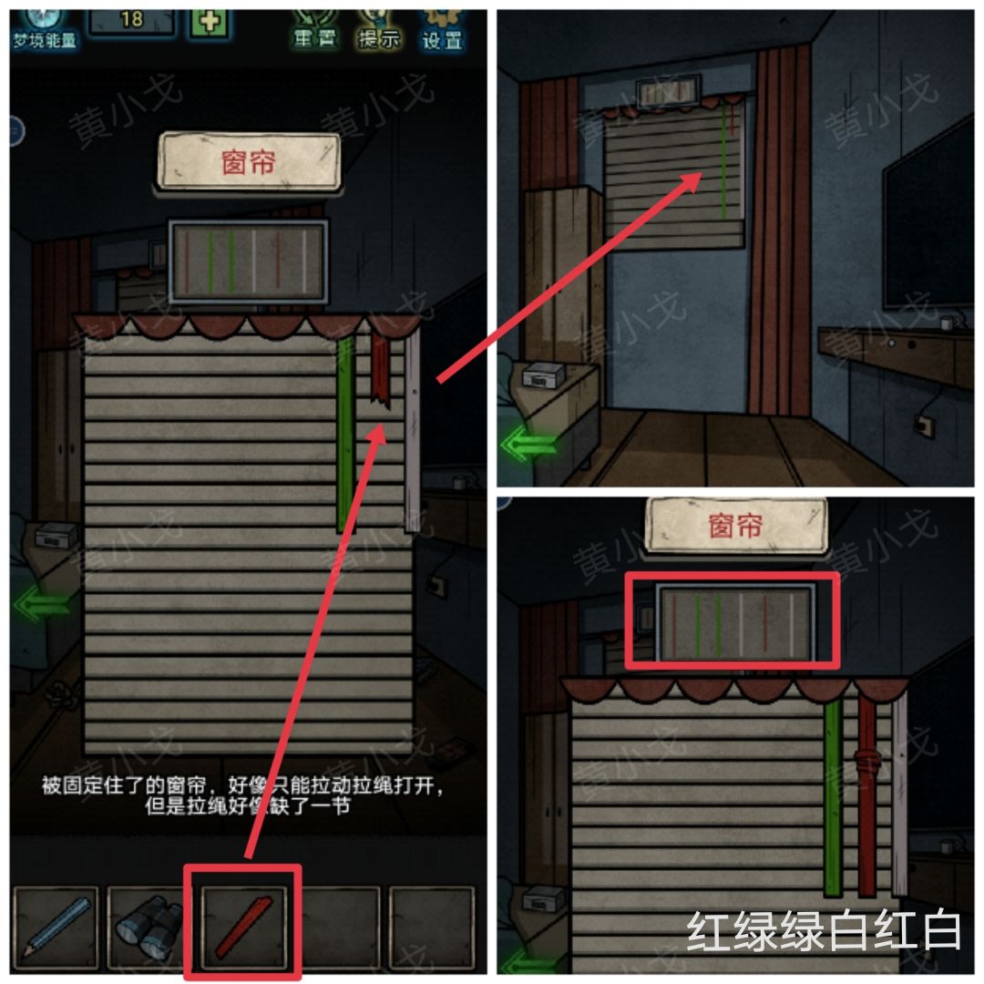 23.点击窗帘,装上【红色的布条】,根据上方的提示,按(红绿绿白红白)的顺序拉动拉绳