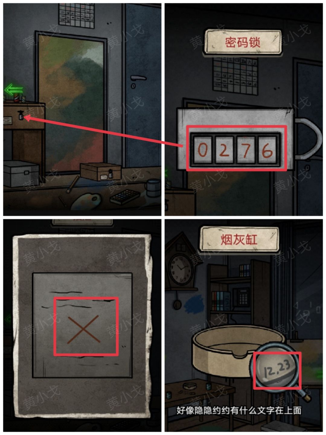 7.(画室右)点击桌子的抽屉,根据烟灰缸上的线索(1223),结合旁边纸条上的线索(✖️号),输入密码:0276