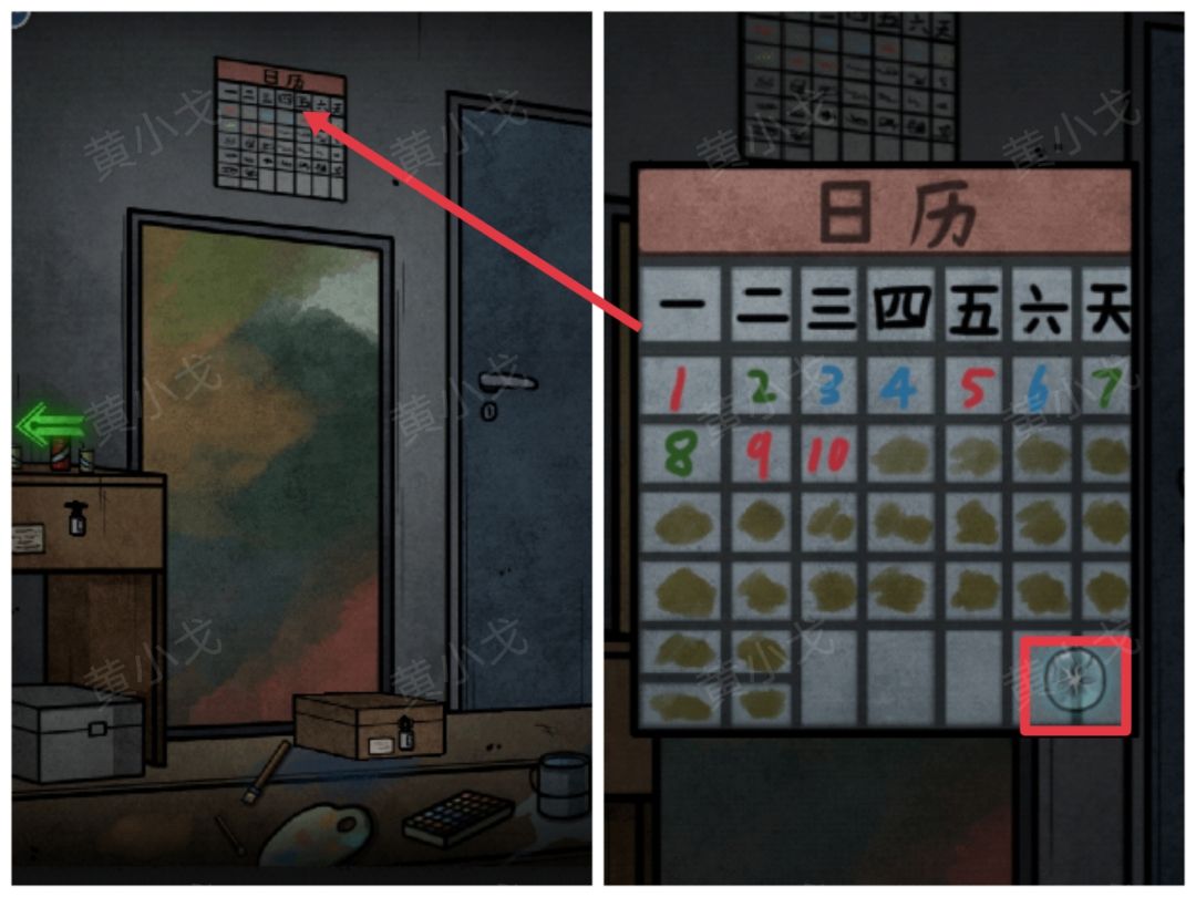 14.点击墙上的圆盘机关,根据日历上的线索,按(红-逆、绿-顺、蓝-逆、蓝-逆、红-逆、蓝-逆、绿-顺、绿-顺、红-逆、红-逆)的顺序点击按钮