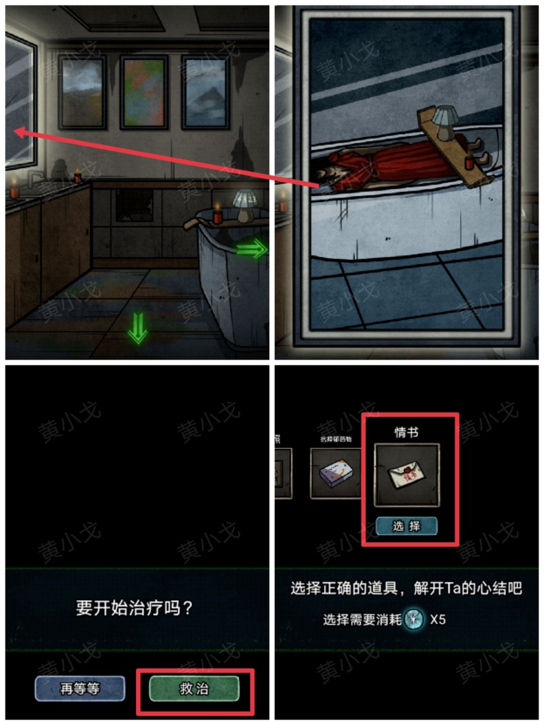 39.点击镜子,触发剧情;点击开始救治,选择(情书)解开Ta的心结