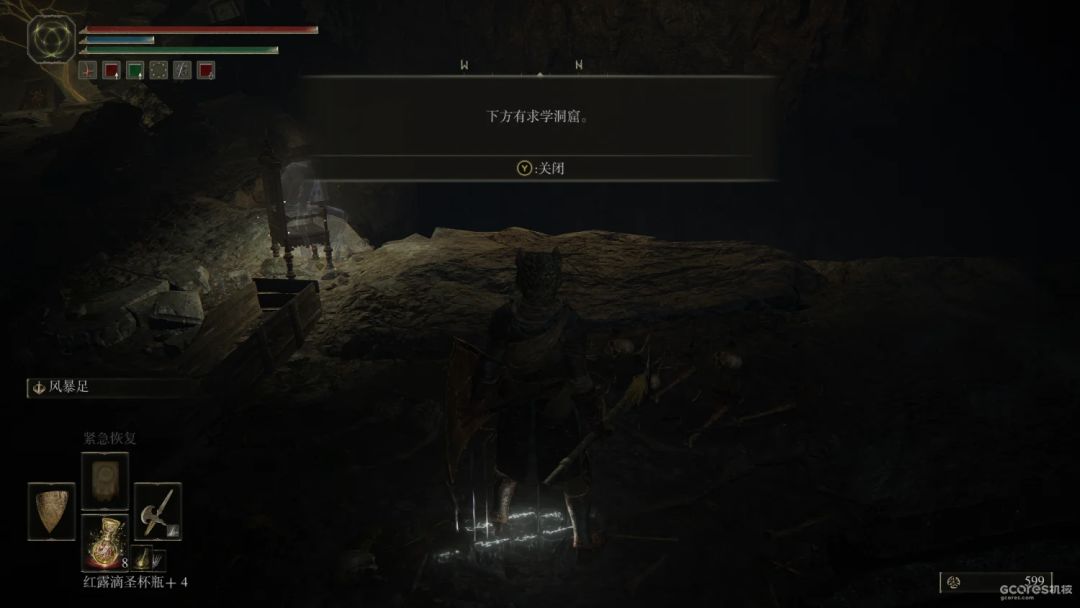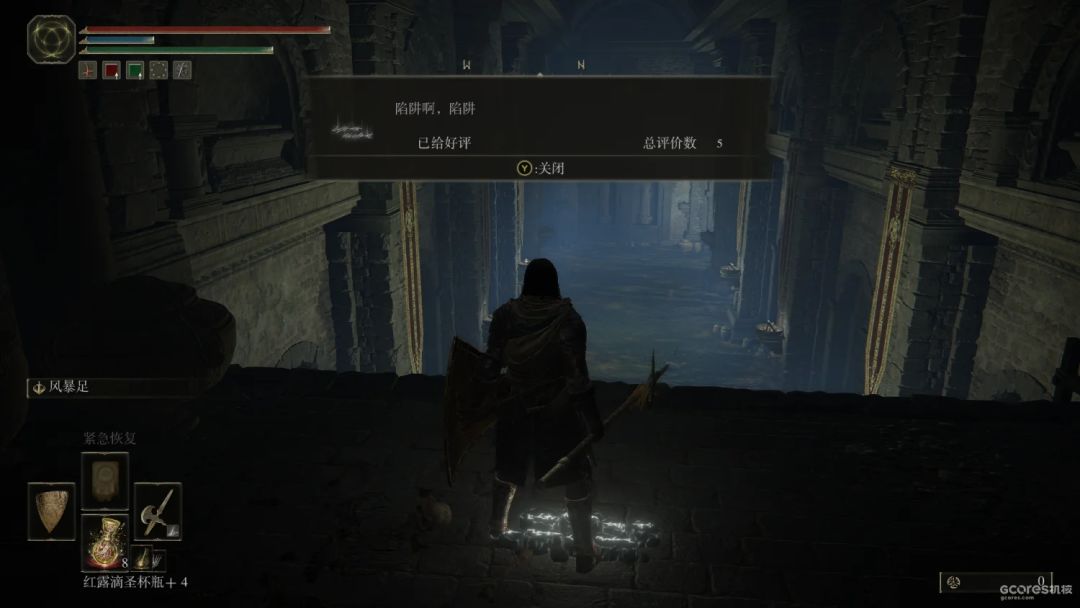 因为魂系列没有很多的RPG那样明显的探索指引,就连大地图也是《艾尔登法环》这次才加入的功能。这就导致很多隐藏道路或是道具往往被急于赶路(或者逃命)的玩家错过。但是如果某个地方有很多谏言,玩家应该都会过去瞧瞧。而这一作的开放世界地图,以及新加入的跳跃、更低的坠落伤害、灵马的二段跳等一系列的革新更加凸显了谏言在探索过程中的重要性。举个例子,在地下墓地里有一种喷火机关,如果是没看过攻略的玩家第一反应估计都是躲或者冲,然后被烧死。但是如果你是在线游玩,一定能在看到机关的同时发现地上的谏言,点开基本都是“接下来远程攻击很有用”。只要拿弓箭之类的东西击中机关,就会解除陷阱。类似的地牢中的谏言很多,很大程度的避免了玩家的卡关。而在箱庭之外的开放世界,谏言对探索的指引更加明显,因为这次的地图实在是太大了!作者本人很多道具和赐福(复活点)都是在前人的谏言指引下发现的。