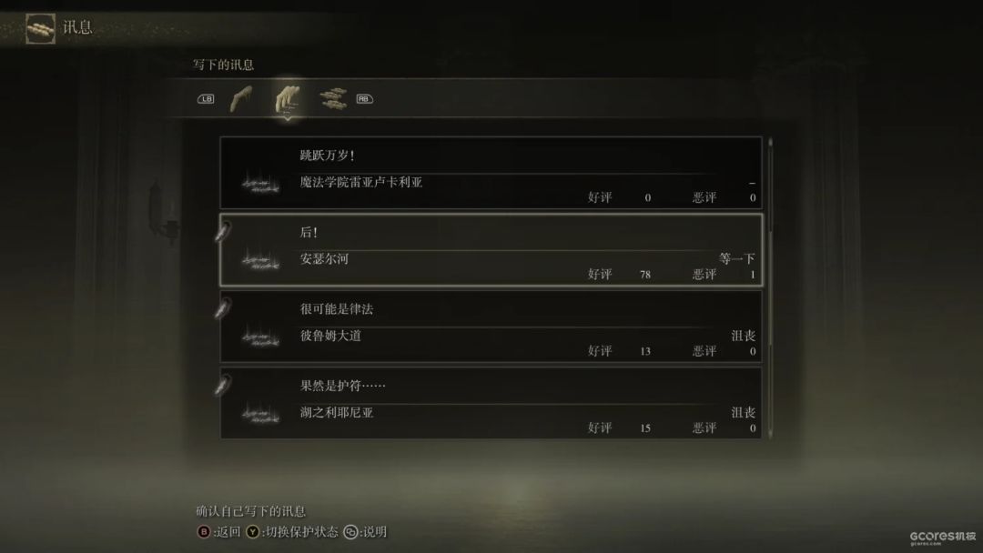 首先给不太了解魂系列的朋友介绍一下谏言系统。玩家在得到特定道具后,可以在几乎所有地图场景以特定的格式,搭配有限的短语,词组,肢体动作等留下自己想说的谏言。谏言有概率被其他来到此地的玩家看到,且可以被其他玩家点赞或者点踩。被点赞的话,写下此谏言的玩家会立即恢复血量,被点赞到一定数量的谏言会更容易被其他玩家看到,也就是成为“热评”。