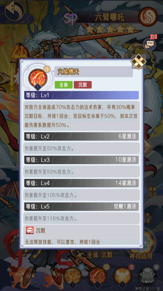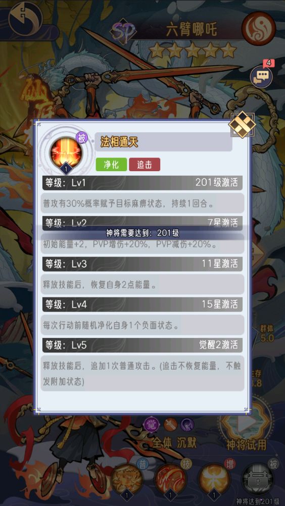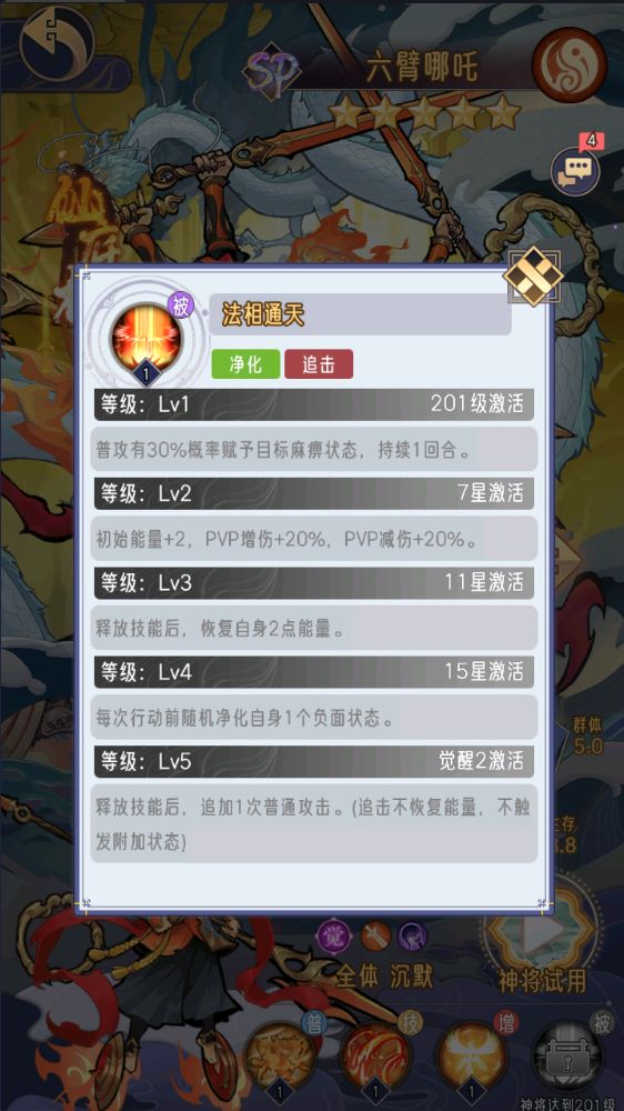 3.升星关键节点,六臂哪吒的星级是很重要的,可以大幅度的提升哪吒的控场能力;关键的星级是7星,加能量使其可以一开始就释放技能;11星释放技能后回能量;15星自带净化负面效果;觉醒2追加攻击大幅度提升输出能力。