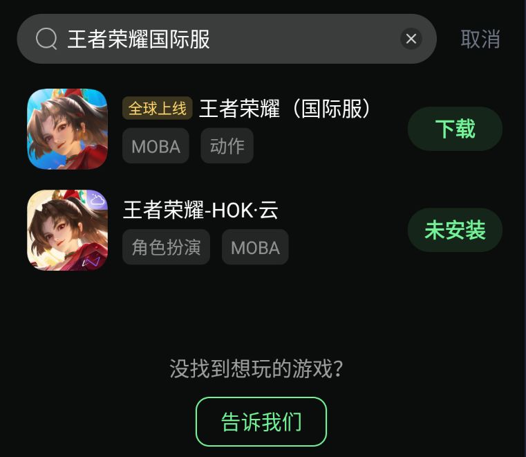 在奇游内搜索【王者荣耀国际服】即可下载游戏(如果提示游戏未安装,则说明奇游版本不对哦~)