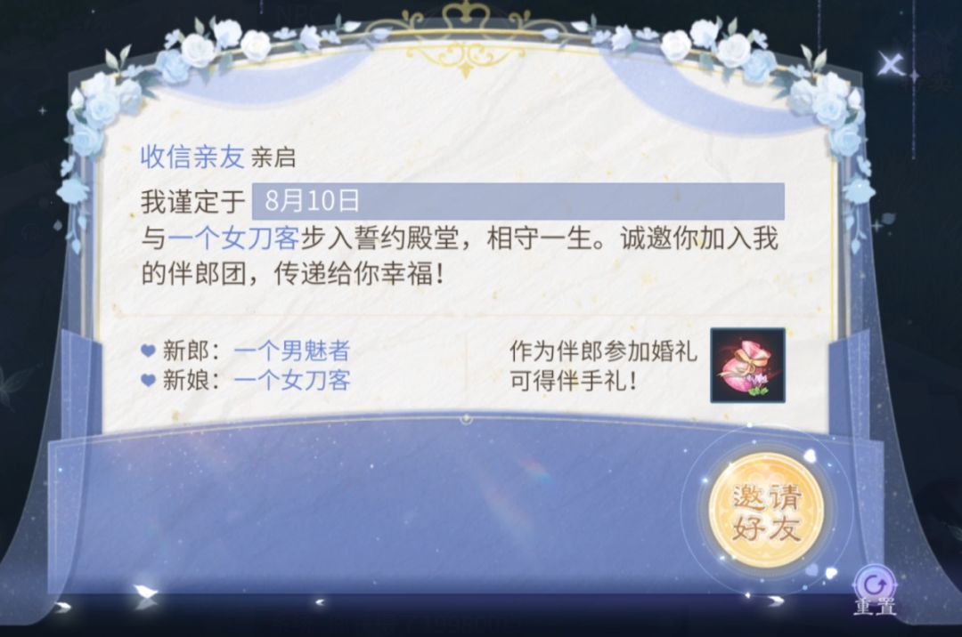 除了婚礼天团,我们还为新人们准备了四种款式的邀请函,可用于邀请好友、帮会、乃至本服所有的有缘人,一同前往婚礼现场见证这对新人一同走向新的三界篇章。