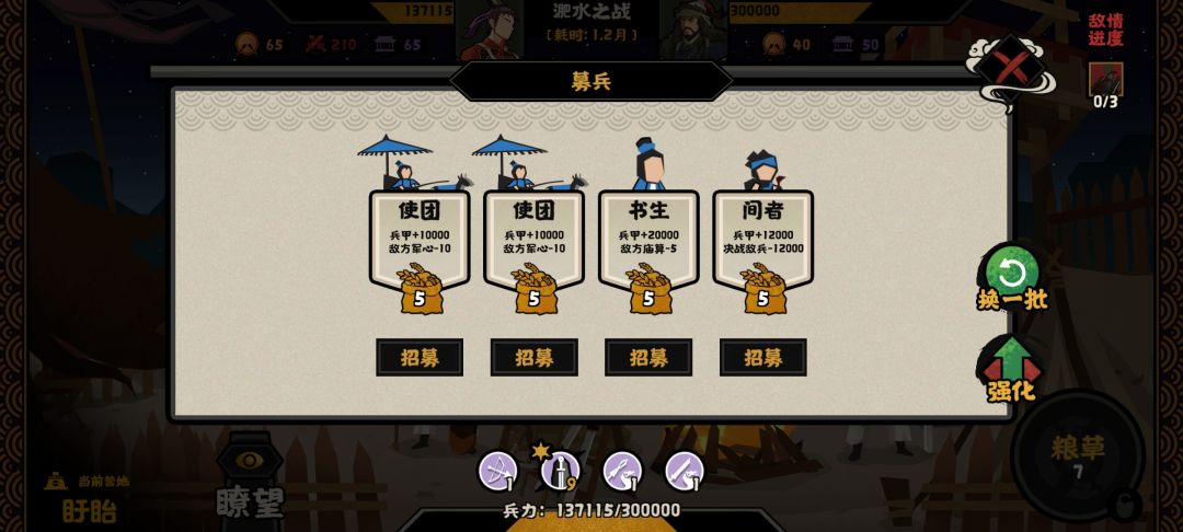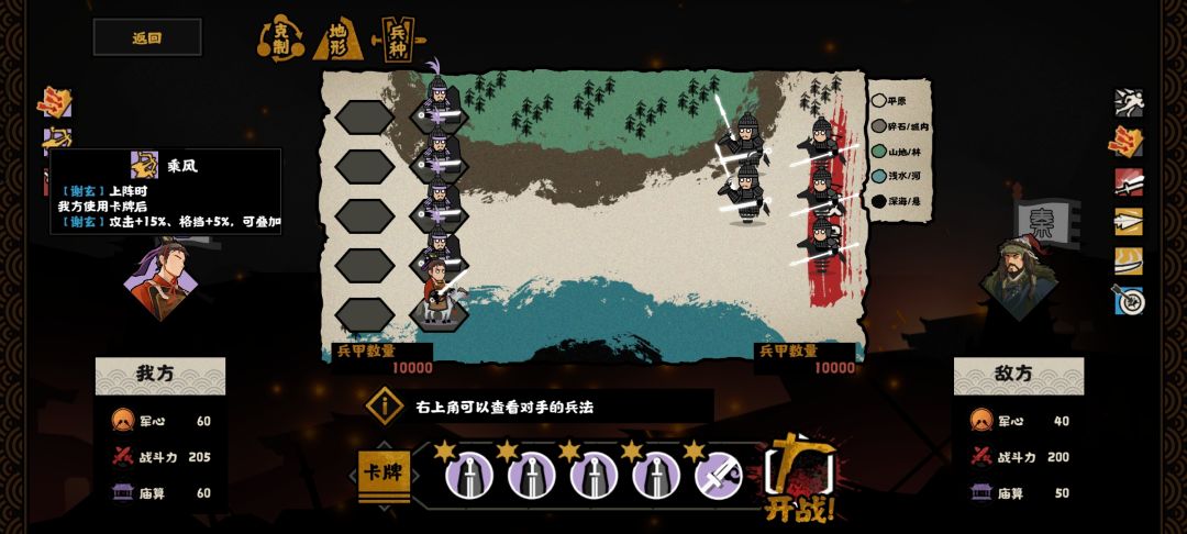 开局先提升募兵等级谢玄有一个乘风兵法,卡牌快点用出去谢玄很厉害,开局直接9级北府兵全部这阵容就行了。
