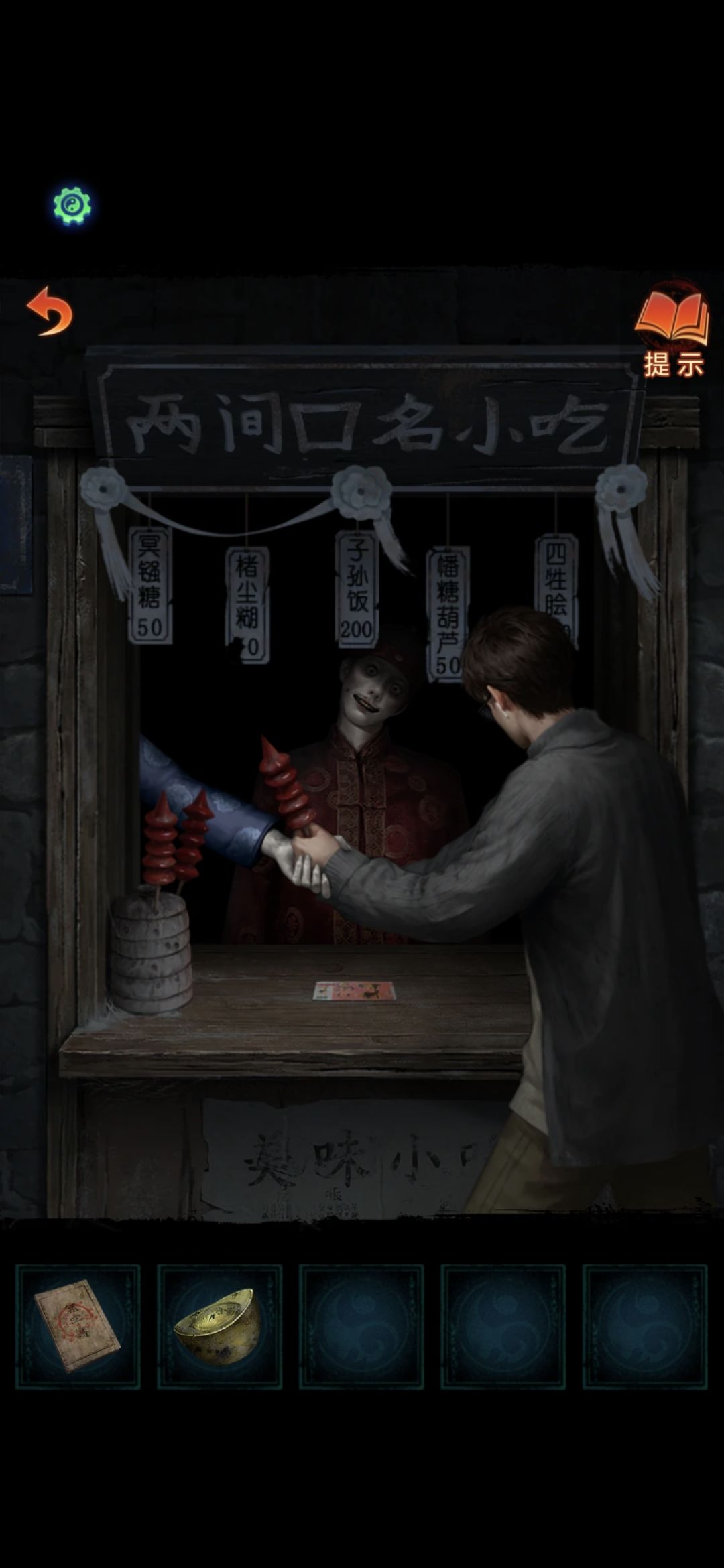 点击左边店铺,根据书中资料可得敲击顺序为四牲脍,楮尘糊,子孙饭,冥镪糖,楮尘糊,点击完毕后获得楮尘糊