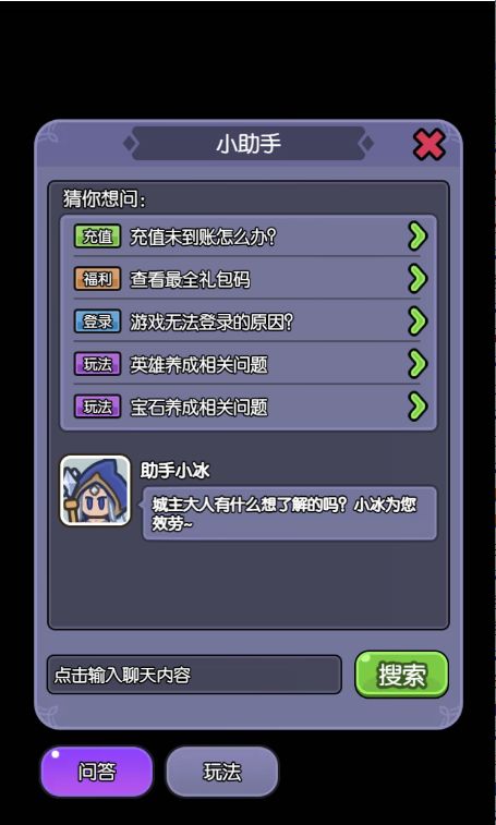 城主在主界面顶部的功能栏中可以打开我们新增的游戏小助手,我们的助手小冰可以为各位城主解答一些日常游戏中的疑惑。