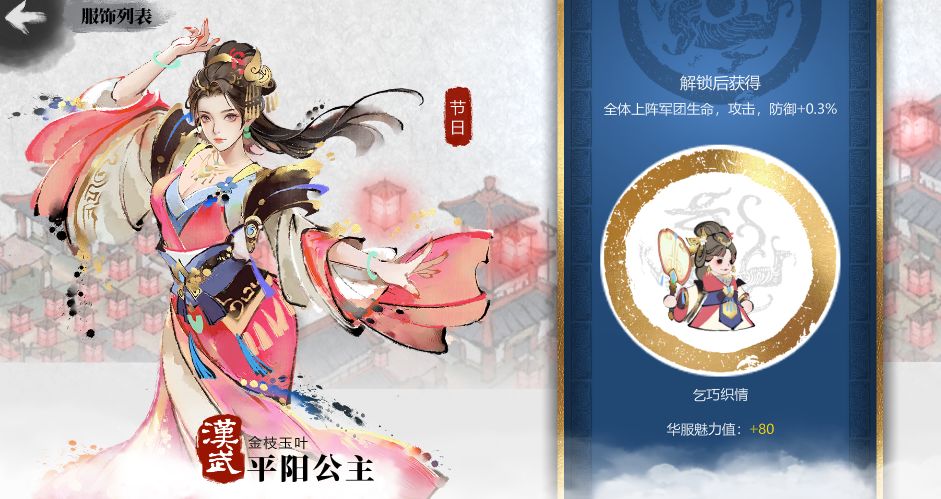 ●技能:平阳公主【汉宫秋月】:释放技能立即提升自身方阵2%、6%、10%、14%、18%、22%、30%策攻和4%、6%、8%、10%、12%、15%、20%攻速,持续15秒,可驱散;并为我方血量最低的5名汉武阵营友军以及卫青方阵和自身方阵连续恢复2.47、2.52、2.57、2.63、2.68、2.74、2.79倍,2.73、2.79、2.86、2.92、2.98、3.04、3.1倍,2.98、3.05、3.11、3.18、3.25、3.32、3.39倍发动武将最大策攻的血量,并为其增加增加2%、4%、6%、8%、10%、12%、15%的伤害,持续25秒,并额外为友军卫青、霍去病、卫子夫、刘彻方阵增加2%、4%、6%、8%、10%、15%、20%减伤和最大生命值2%、4%、6%、8%、10%、15%、20%的护盾,持续25秒,可驱散。