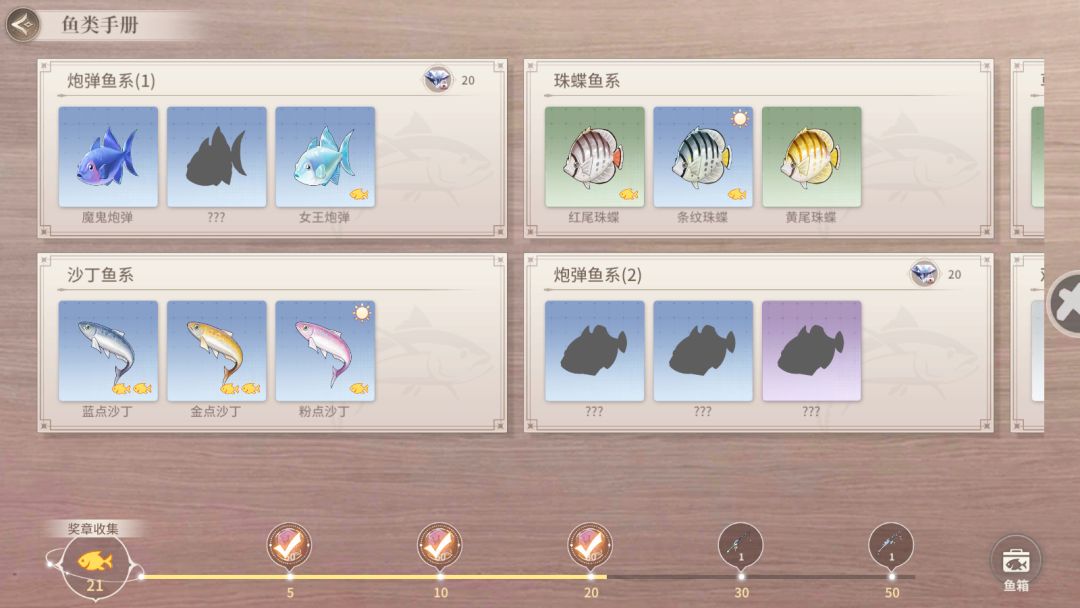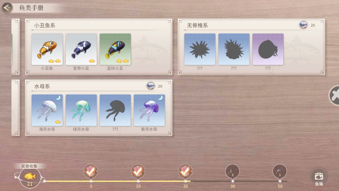 可以在鱼类手册内看到集齐了哪些