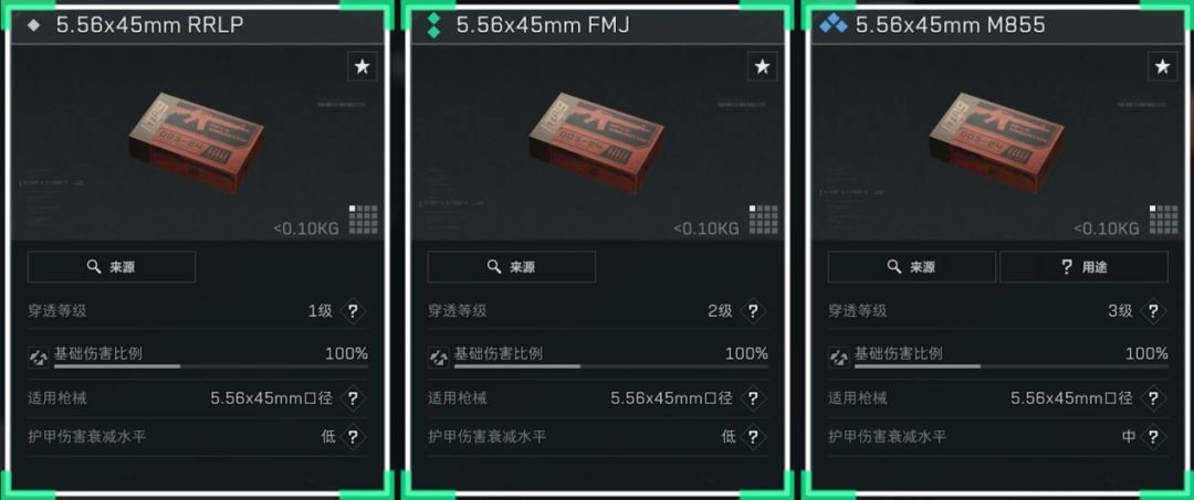 5.56x45mm口径各个型号弹药目前基础伤害比例均为100%,共有从1级到5级,合计5个穿透等级。