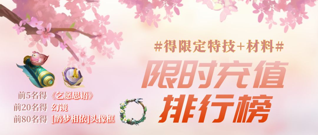 活动详情:排行榜主界面开启【七夕】充值榜单分页,活动期间的充值额度,将记录在此榜中,充值上榜名额为前80名,排名前80名的玩家可获得额外赠送奖励+七夕限定头像框!