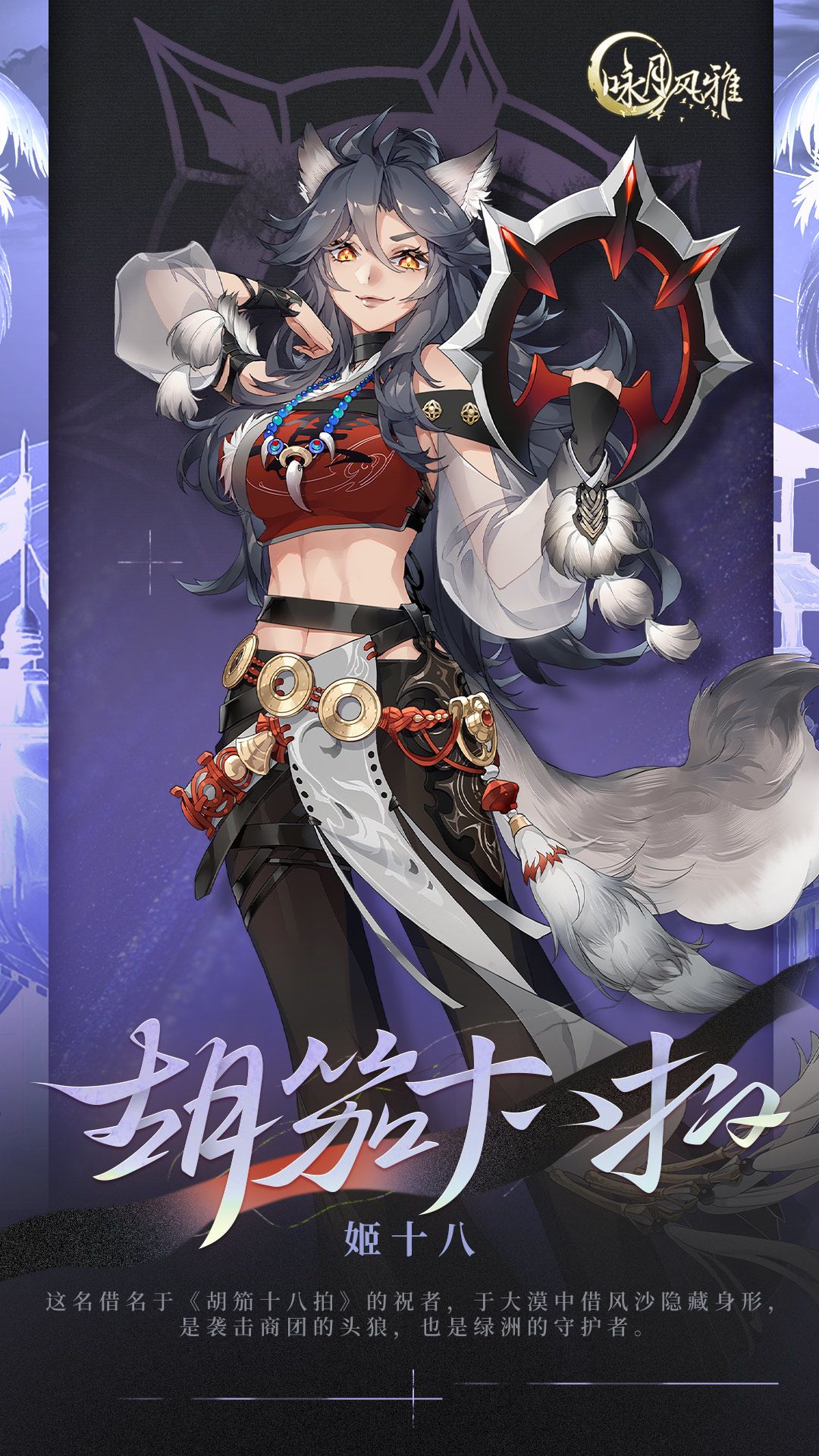这名借名于《胡笳十八拍》的祝者,亦是大漠中借风沙隐藏身形,袭击商团的头狼。然而,她不仅是强悍的义匪,还是温柔的守护者——她将遇到的所有孤儿都收养在大漠深处的“绿洲”,将他们视为己出。闲暇时间会教孩子们简单的书写技巧和琴曲。