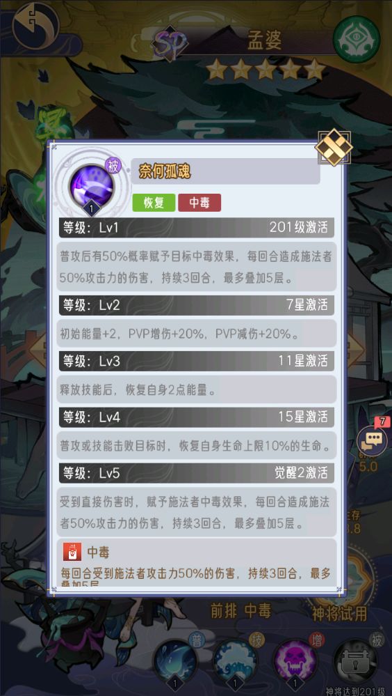 3.升星关键节点,孟婆的星级是很重要的,可以大幅度的提升孟婆的容错,不管是上毒还是恢复和减伤;关键的星级是7星,加能量使其可以一开始就释放技能以及增加伤害和减伤(刚需);11星释放技能后回能量;15星时攻击可以恢复生命;觉醒2时受击也会上毒,极大地提高了上毒效率。