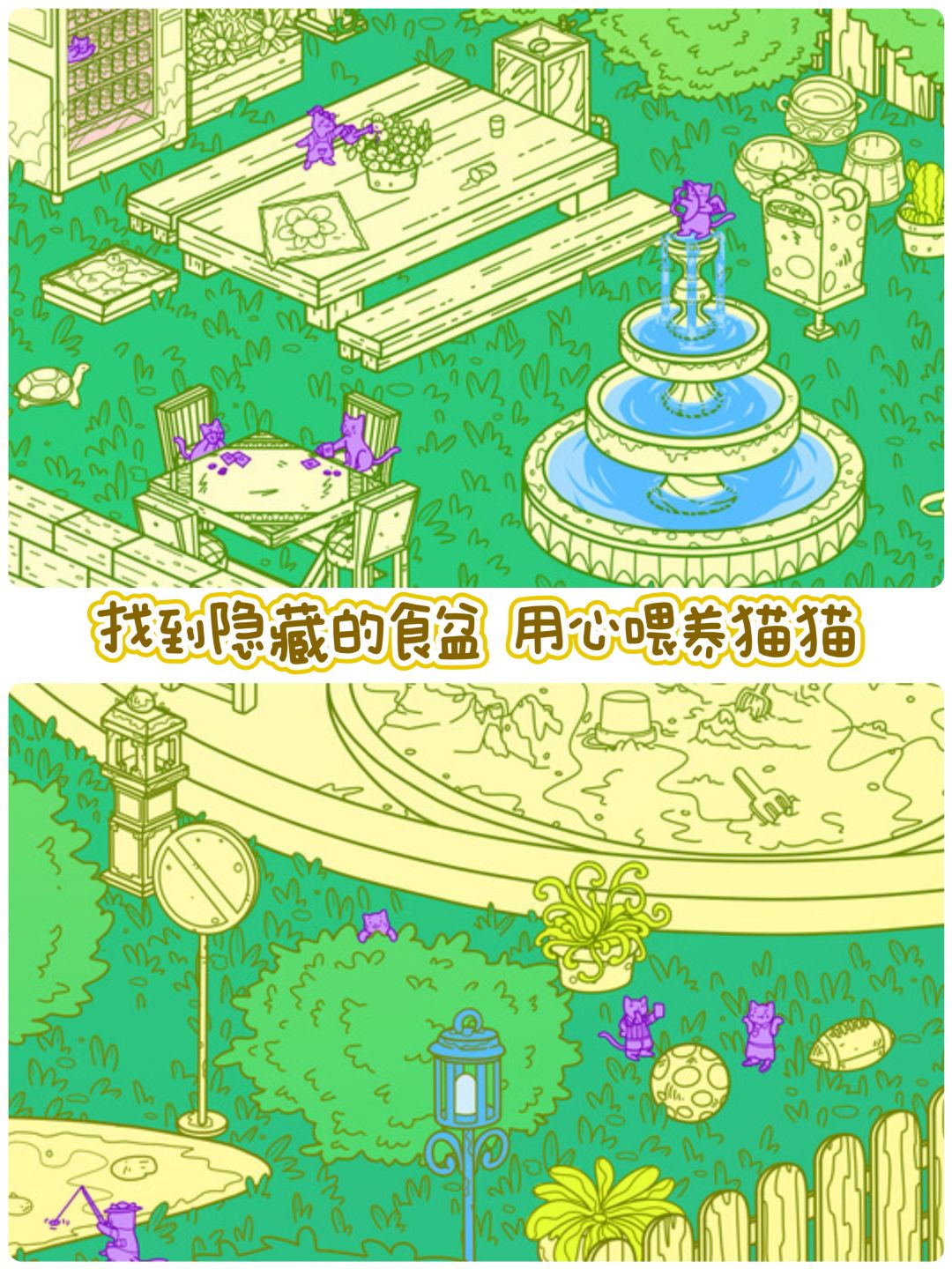 🍽 寻找食盆,喂养你的新朋友 —— 游戏中的猫咪们需要你的关爱。找到隐藏在小镇各处的食盆,用你的爱心喂养这些小家伙,看着它们在你的关怀下茁壮成长。