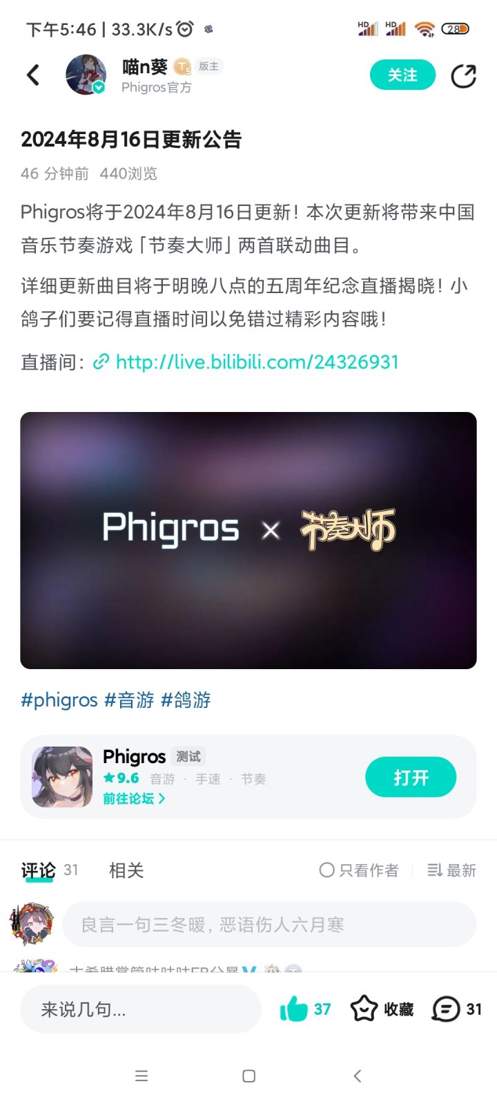 说实话我是没啥反感的,打音游被不认识的人说成节奏大师大概率是因为他之前没玩过其他音游而且也没接触过节奏大师,就是圈外人,印象也只是停留在好几年前停服过的节奏大师那一时候,因为能坚持玩下去的人不会对节奏大师模糊而且肯定会区分两者之间的差别。第二点,联动出圈感觉也不用太过担心,因为这是音游之间的联动,不是那次抖音事件让所有圈外人都了解Phigros并加入,现在还玩节奏大师的人也应该对音游有一定的基础,也能明白和其他音游不同的点,也有很多音游玩家也在玩节奏大师,比如DJGun,沉默微笑都等等。最后一点,按鸽游的挑曲应该会选择音游曲的,而不是网红歌曲,节奏大师也有很多优质的原创曲子,比如M2U(Phigros和overrapid联动的神话就是出自他手,也是我很喜欢的乐曲)的君往何处,还有暗夜苏醒,黄金之城,无可言喻等等