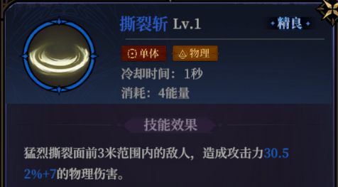 撕裂斩:物理系的小范围伤害法术,升阶后的效果不仅能增加额外造成伤害,刀光扩大攻击范围,还能增加给敌人上debuff的效果,而且冷却时间极短,在心得槽上可以做到无缝衔接。