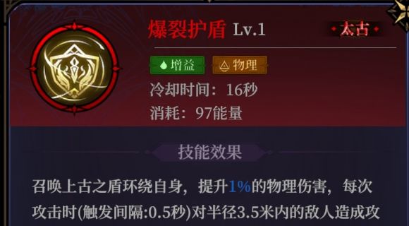 爆裂护盾:物理系的持续性增益伤害法术,并且能持续造成伤害,升阶后不仅增加受伤也造成伤害的能力,还会提升法术伤害,高阶还能给敌人施加debuff