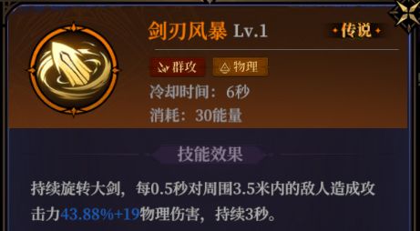 剑刃风暴:物理系的持续旋转小范围伤害法术,物理系经典法术,升阶后不仅增加给敌人上debuff的能力,还会提升伤害,高阶还能额外造成随机方向伤害,且冷却时间较短。