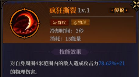 疯狂撕裂:物理系的范围伤害法术,效果单一直接,升阶后不仅额外提升伤害,还会增加给敌人上debuff的能力,同时还会对有debuff效果的敌人提升伤害,高阶击杀敌人还能随机减少其他法术冷却时间,极为全面