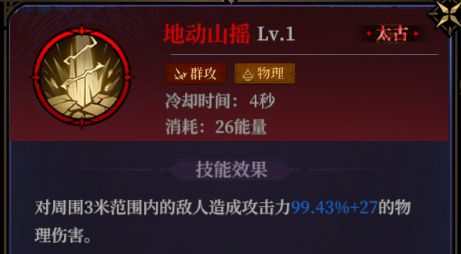 地动山摇:物理系简单直接的小范围群攻法术,升阶后不仅能额外增加伤害范围,还会给自身施加额外buff且概率较高,高阶能对有物理debuff的敌人提高伤害及增加额外的debuff,而且冷却时间很短,也能放置于心得槽使用