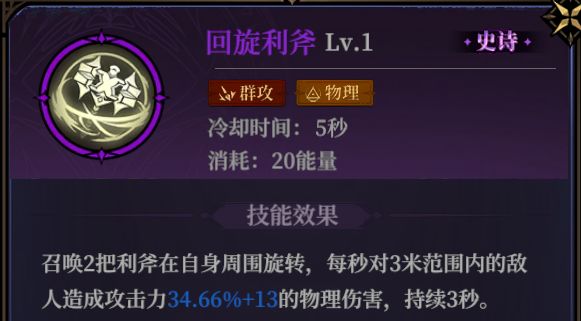 回旋利斧:物理系持续环绕自身的小范围伤害法术,且利斧跟随人物,升阶后对施加有初级debuff状态的敌人有概率增加进阶的debuff状态,同时也会增加法术伤害效果,而且冷却时间还很短。