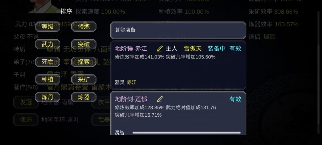 虽然现在才二周目,但是我个人觉得大多数的地阶装备,包括地阶武器觉醒了器灵都要比天阶装备属性要好,包括天阶武器觉醒了器灵一样,掌门修为上去后,天阶装备多如毛,但是我只拿来卖了换灵石,因为天阶装备的属性是真的差,感觉就是拿来摆设的,获取难度高,性价比还要比地阶的要低,建议加强一下天阶装备的属性