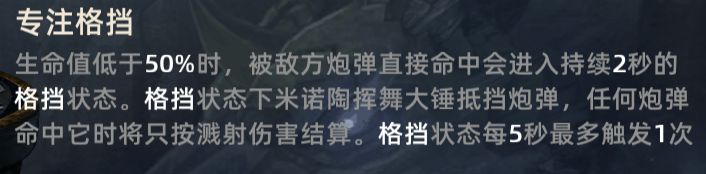 被动技能-专注格挡,在血量低于50%被炮弹命中进入格挡状态,持续时间2秒,冷却5秒。可以抵抗敌人的多段炮弹或双发强化。