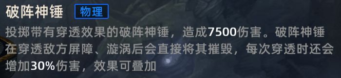 终极技能-破阵神锤,战略性强的终极技能,面对敌方的屏障、旋涡类技能可直接摧毁并强化技能伤害,打乱敌方节奏。技能的基础数值在及格线,随摧毁敌方技能强化后可打出大量伤害。