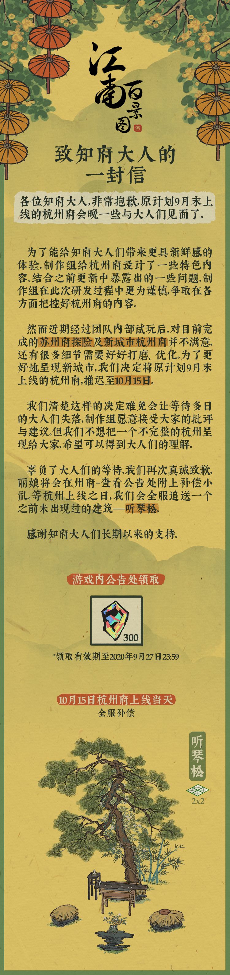 有关致歉、延期补偿、接下来的版本规划、以及活动剧透等,还请知府大人们点击下图查看详情。