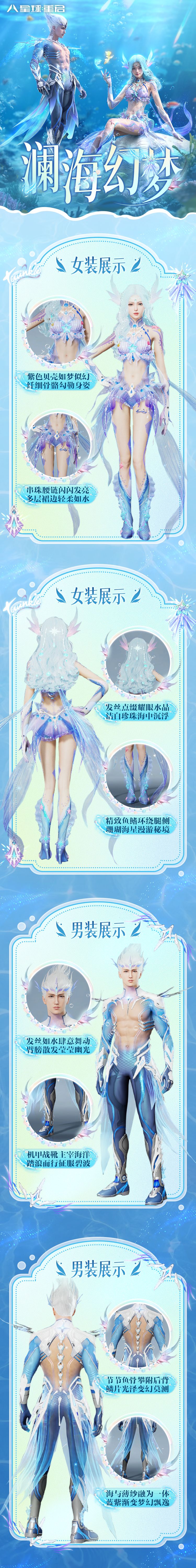 深蓝不止,浪漫不休!「澜海幻梦」时装包含整装、头饰、手部、鞋子共四个部位,女款贝壳胸衣搭配多层次流光拖尾,发丝化作浪花,治愈唯美;男款则融入更多机甲与骨骼元素,梦幻的同时更多了一分硬朗。使用「澜海幻梦」社交动作后,就这么水灵灵地变成美人鱼了?!全体鱼儿听我号令,游!