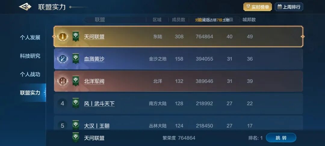 天问联盟领跑全服,优势明显,目前这个联盟繁荣度,即便是在靠前区服也是很耀眼的存在,期待他们在天空城竞赛和下个赛季的表现!