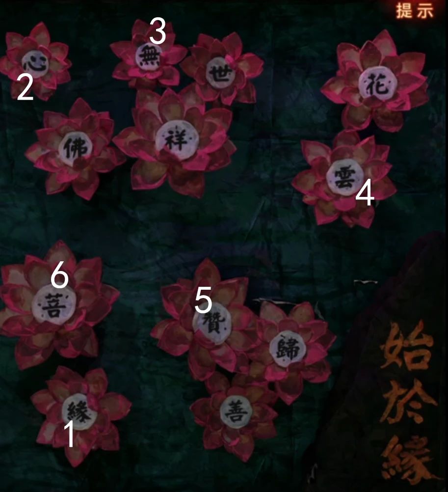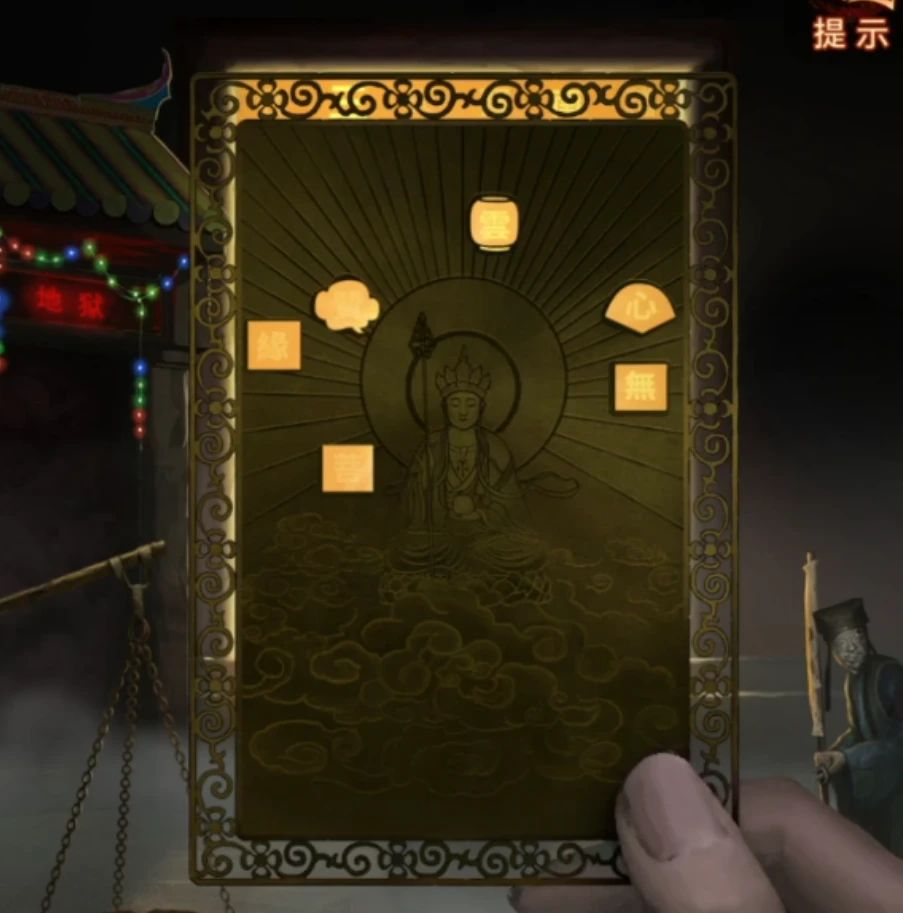 先拿出带孔的小卡片,果然菩萨后面的背景墙上的字会出现在小孔里面,记一下长方形=缘,云朵=赞,正方形=菩,灯笼=云,扇子=心,又一个正方形=无,因为有相似的图形,所以这个可能不是形状线索,把字亮起的顺序也记下来缘-心-无-云-赞-菩,这里其实是循环亮起的,所以第一个字不一定是缘只是记下顺序而已。