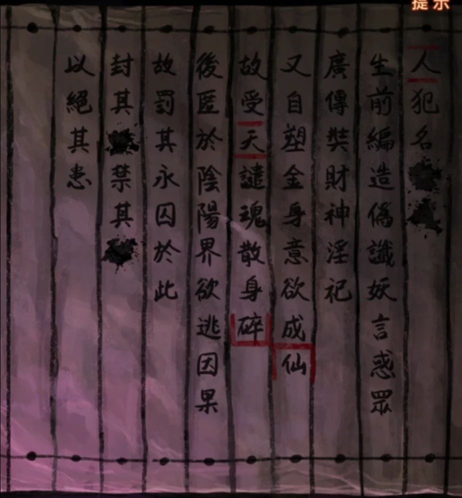 出门来到阴阳牢,先使用毛笔在桌子上登记一下吧,登记结束后从牢狱手中拿到女主照片,再次回到剧场,查看一下舞台上色彩斑斓的赛博灵台,点击照片最下面的那个花坛,花坛移动后出现四个按钮和一条缝,对那条缝放入女主照片后就可以开始调整了,第一个按键是中间照片,自然是调整为女主了。第二个按键是左边的对联,第四个按键是右边的对联,我们前面竹简上看到被上包围的字是仙,被下包围的字是碎,也就是左右对联必定有第一个字是仙和最后一个字是碎的,那么能用的对联也只有哭灵心欲碎和仙驾返瑶池了,竹简上被上下划红线的字是天和人,也就是最上面的横批要有天和人字,那么第三个按钮调整的上面只能是天人同悲了,调整好后如下图拿到入场券。