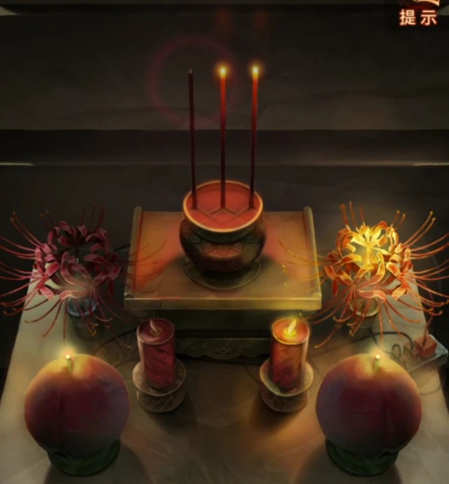 暂时没有更多线索,查看一下无字书吧,果然出现了线索,结合供桌上的东西理解一下,香叫天地人,那么天无眼就是天的那根香不要点亮,花灯和红烛西边的不点燃,一般来说上北下南左西右东,也就是左边的不亮,只点右边的,寿桃是两个都要亮的,调整一下供桌上的东西。